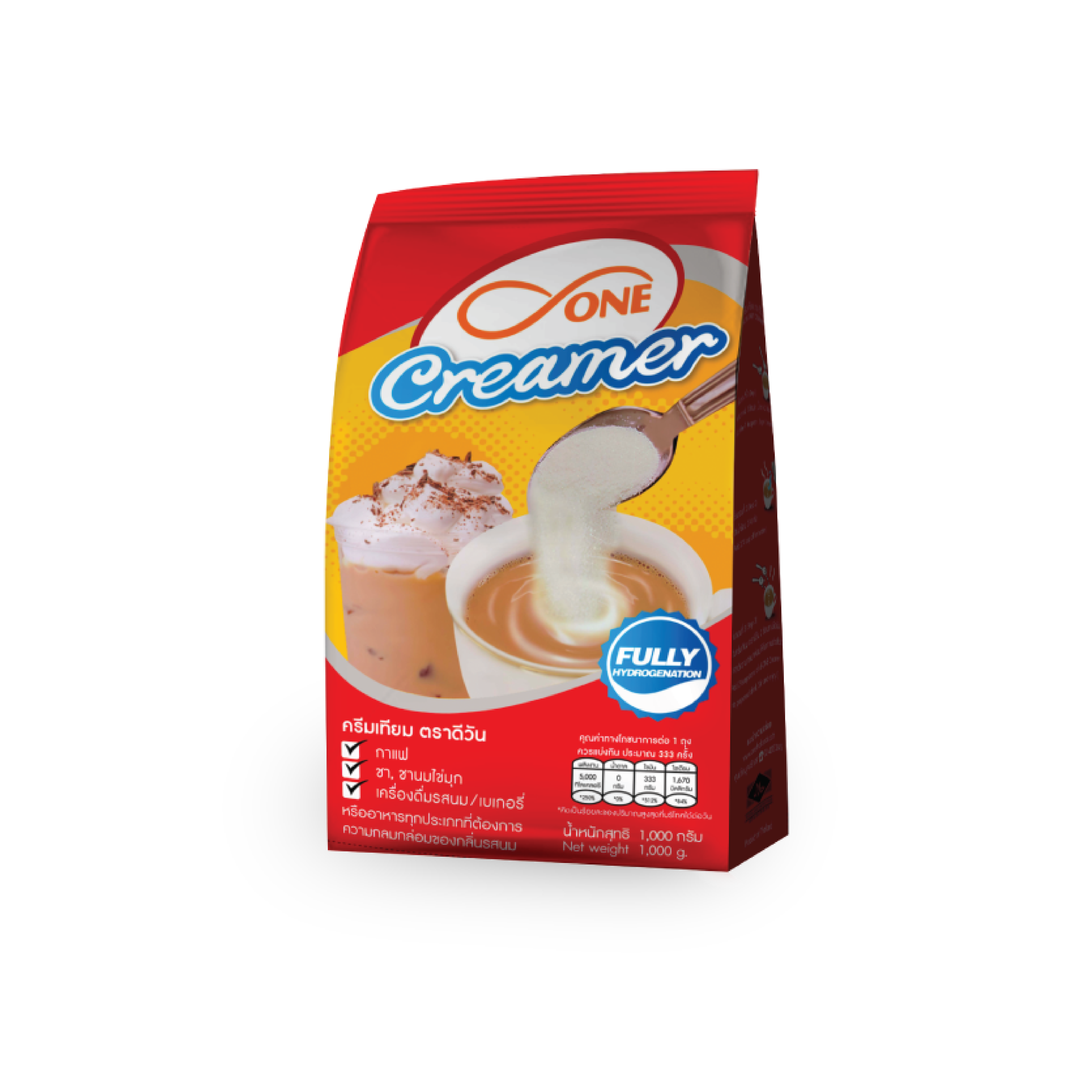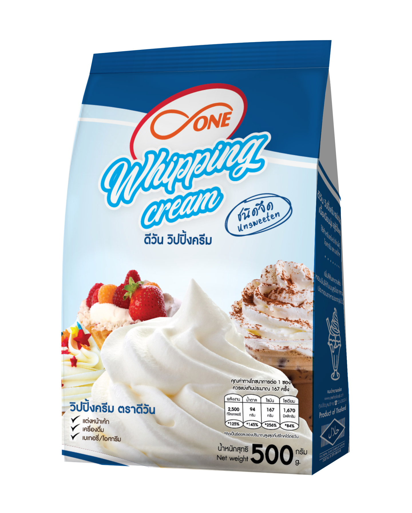 "d-ONE" Sweetened Whipping Cream Powder has a delicious taste, a soft texture, and stays insoluble. used for decorating cakes, drinks, ice cream, and various baked goods. You can add color and richness to your favorite dishes, and it can be used in soup dishes as well.
